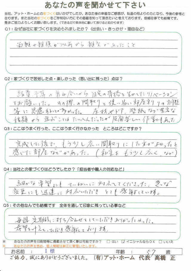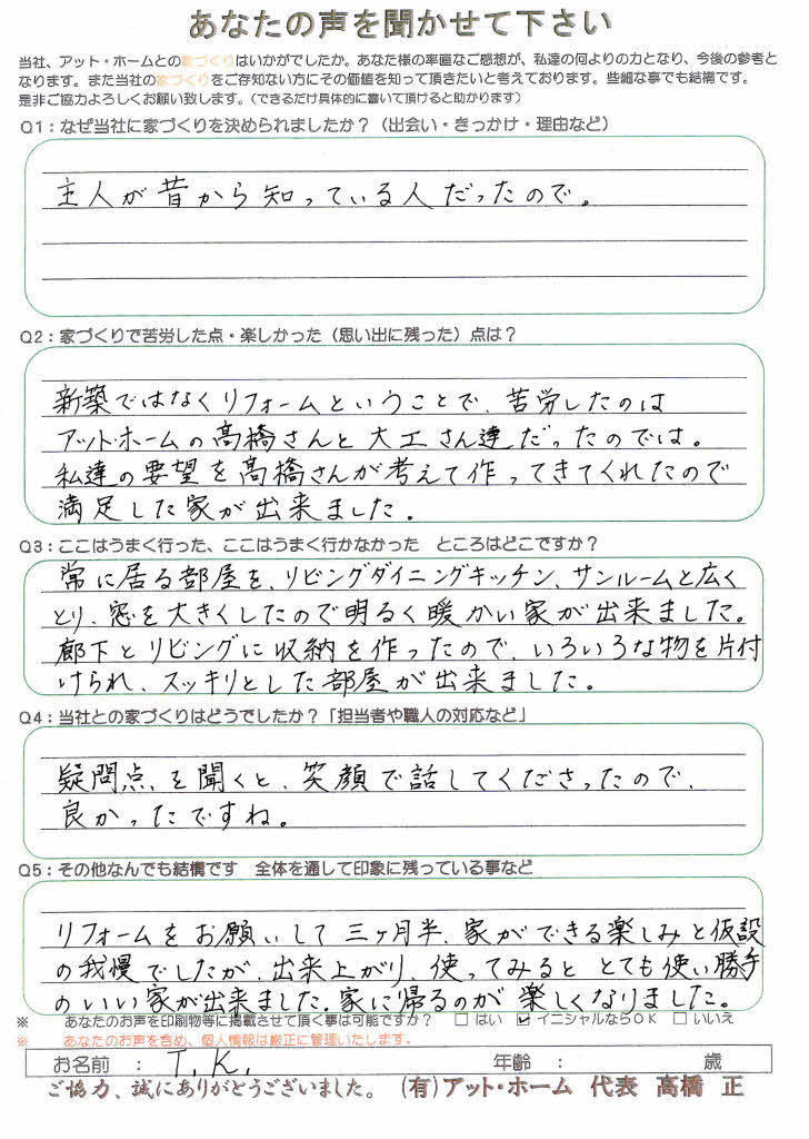 新築ではなくリフォームということで、苦労したのはアット・ホームの高橋さんと大工さん達だったのでは。私達の要望を高橋さんが考えて作ってきてくれたので満足した家が出来ました。