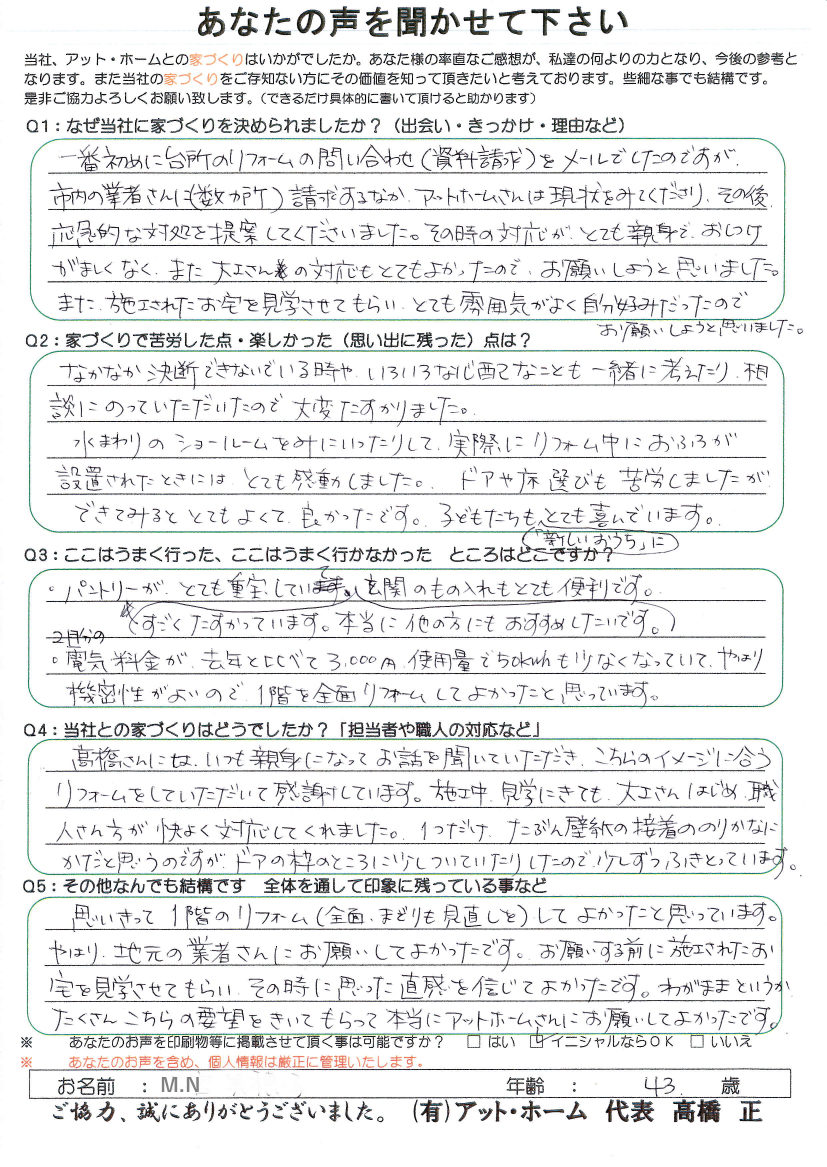 思い切って1階のリフォーム(全面・まどりも見直しを)してよかったと思っています。やはり、地元の業者さんにお願いして良かったです。お願いする前に施工されたお宅を見学させてもらい、その時に思った直感を信じてよかったです・わがままというかたくさんこちらの要望をきいてもらって本当にアット・ホームさんにお願いしてよかったです。