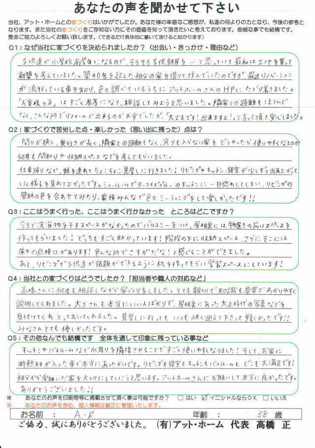 子供達が小学校高学年になるので、そろそろ子供部屋を…と思っていて最初は土地を買って新築を考えていました。築40年を超えた祖父の家を借りて住んでいたのですが、最近リノベーションが流行っている事を知り、色々調べているうちにアット・ホームさんのHPにたどり着きました。「お客様の声」はすごく参考になり、相談してみようと思いました。隣家との距離もほとんどなく、こんな所でリフォームが出来るのか不安でしたが「大丈夫です!出来ますよ!」と言って頂き安心しました。