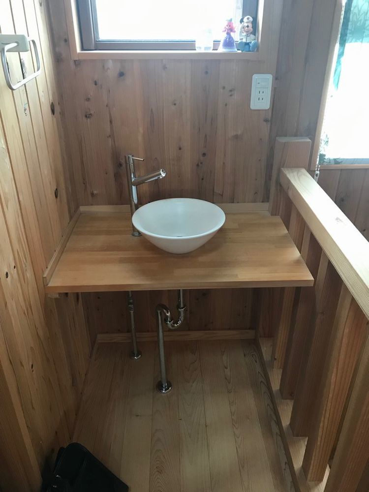 シンプルな手洗い器を、電気温水器付きの実用的な洗面台に変えたいとのご希望でした。